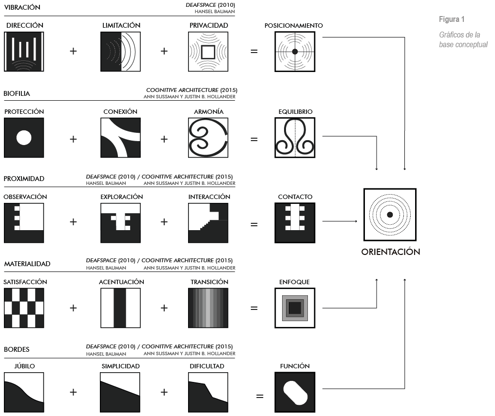 Para el planteamiento del centro educativo, se consideran dos teorías principales. En el caso de la neuroarquitectura, se analiza el libro Cognitive Architecture [Arquitectura cognitiva] (2015), de Ann Sussman y Justin B. Hollander. Por otro lado, en el caso del diseño espacial especializado para personas con sordera, se estudia la teoría del DeafSpace (2010), de Hansel Bauman. A partir de estas teorías, se extraen ideas que se relacionaron entre sí y se sintetizan de tal manera que puedan generar diferentes intenciones de diseño que contribuyen de manera explícita y positiva a facilitar la exploración espacial de las niñas y niños con sordera (véase la figura 1).