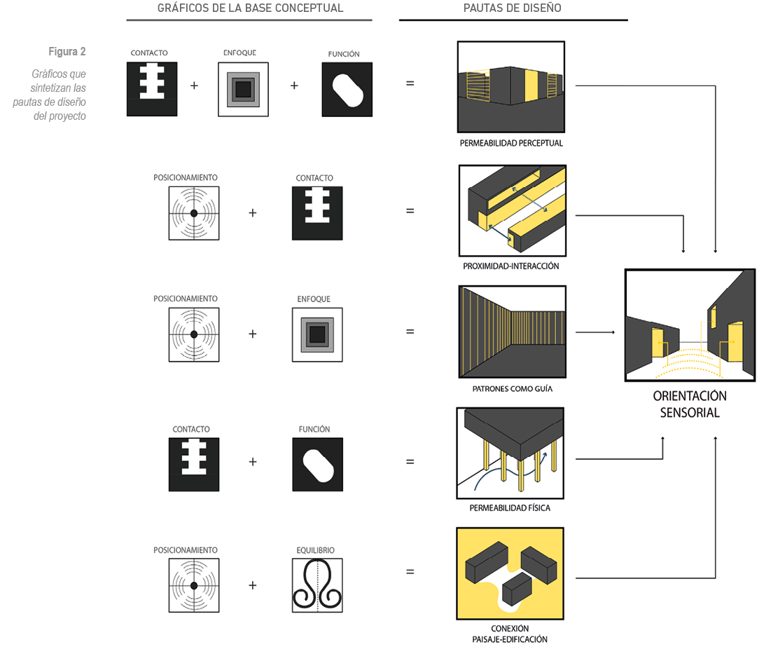 Se tomó en consideración la importancia de los sentidos de la vista y el tacto para estos usuarios. De la misma manera, se profundizó en los conceptos previamente explicados del DeafSpace (2010) y del libro Cognitive Architecture (2015); de esta manera, se agrupan ciertas ideas que se convierten en pautas de diseño, que nos brindan el principio que estructurará la toma de partido: la orientación sensorial (véase la figura 2). A continuación, se explicará cada una de estas pautas de diseño.