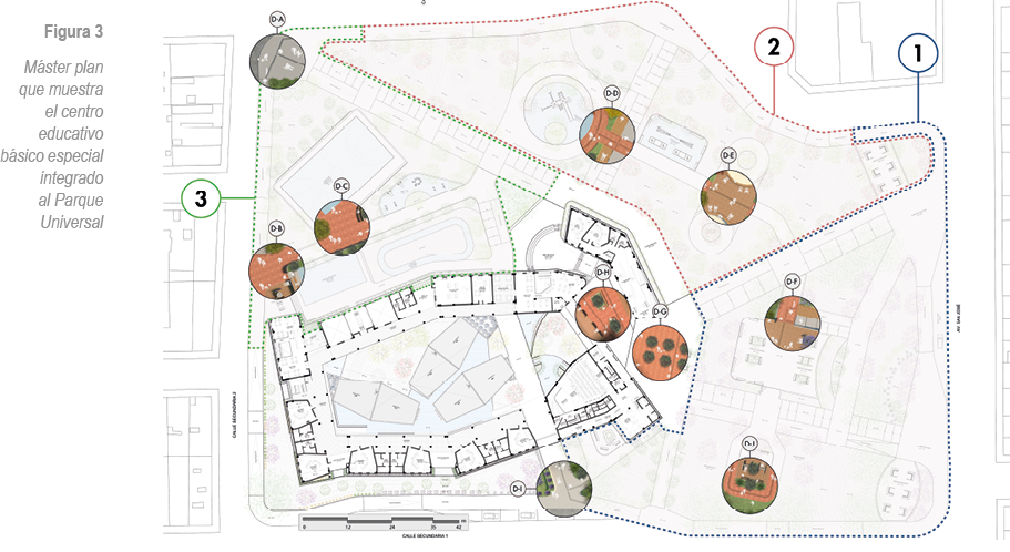La idea que guía la estructuración del diseño del proyecto es la orientación sensorial, y esta se ve reflejada en todas las zonas y ambientes. Así, se emplaza el parque como parte del colegio (véase la figura 3); esta característica se consigue respetando los límites de construcción, pero integrando las circulaciones, áreas verdes y dinámicas de ambos usos (educación y espacio público). Además, el parque se adapta a los desniveles topográficos y los aprovecha para controlar la exposición visual y el acceso físico al centro educativo básico especial; el tratamiento de la topografía genera la percepción de considerar al espacio público como el gran vestíbulo del colegio, pues se ingresa a él desde los niveles más bajos y se recorre en subida.