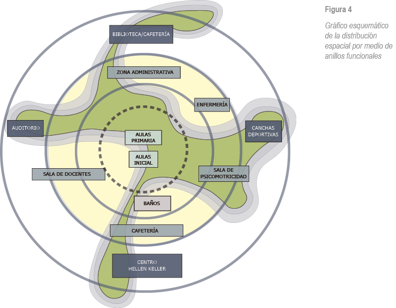 Por otro lado, debido a que el centro educativo estará destinado específicamente a niñas y niños con sordera, el acondicionamiento acústico es de suma importancia. Por ello, el programa arquitectónico funciona como una serie de anillos funcionales (véase la figura 4), los cuales trabajan como capas de filtro: se ubican los espacios de uso común y de servicio alrededor de las zonas de las aulas para protegerlas.