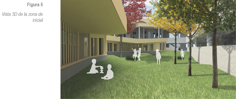 La zona de inicial (véase la figura 5) se configura mediante una serie de módulos repetitivos y simétricos, unificados por caminos que siguen la forma de los bloques, y se complementan con espacios de descanso y juegos (área verde); esta zona funciona como una pequeña comunidad dentro de la villa, y es protegida por los edificios perimetrales que poseen las áreas comunes, administrativas o de servicio.