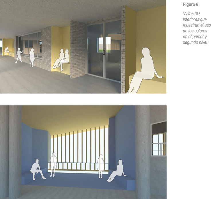 En los espacios de interacción y en las zonas de descanso, se utiliza el color en los muros y pisos para establecer una asociación de uso-color en la memoria de los usuarios. Estos espacios van a aparecer como puntos de color en todo el proyecto e influirán de manera positiva en el ánimo de los estudiantes. Se sabe que determinados colores pueden despertar sentimientos positivos; por ello, los colores elegidos para este proyecto son el amarillo y el azul. La psicología del color explica que el amarillo genera alegría y energía, pues es asociado con el elemento natural del sol, mientras que el azul provoca tranquilidad y paz, y es asociado con el agua y el mar (Bedolla Pereda, 2003).