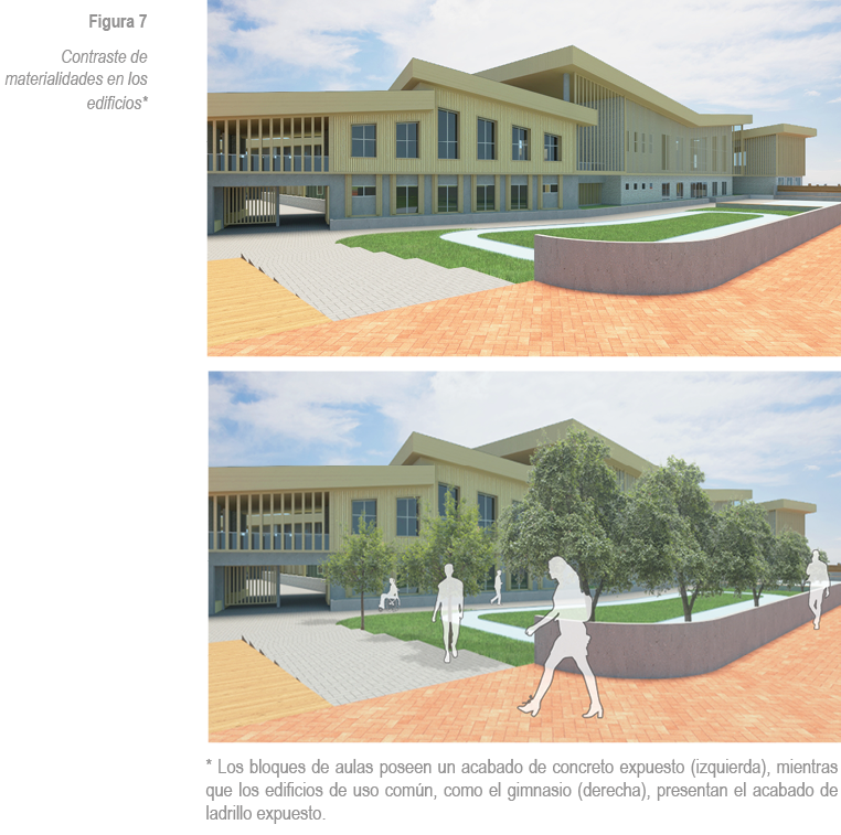 De acuerdo con las estrategias proyectuales previamente explicadas, se utilizan distintos materiales para los edificios (véase la figura 7). En los de uso común o público, se emplea el ladrillo, y este mismo acabado se coloca en los parapetos de los corredores principales del proyecto. Por ende, el ladrillo simboliza el uso común.