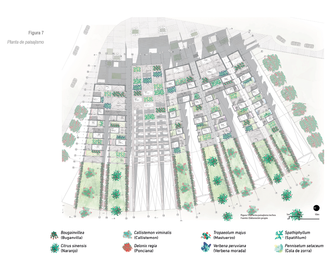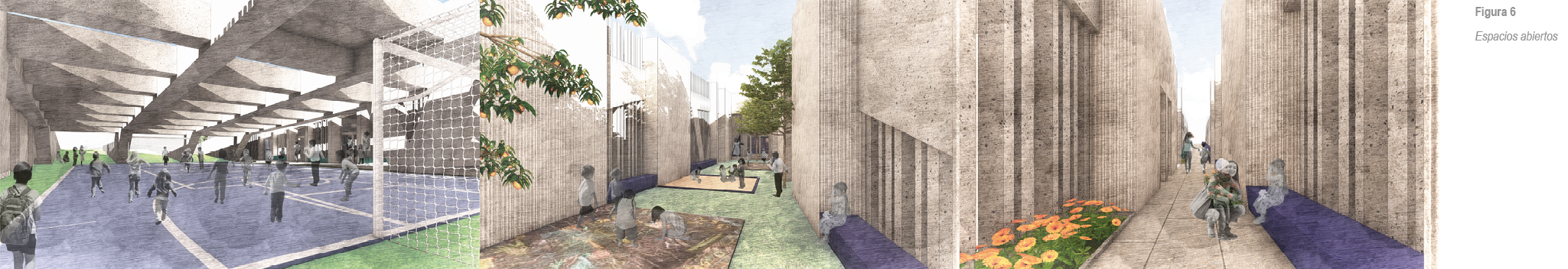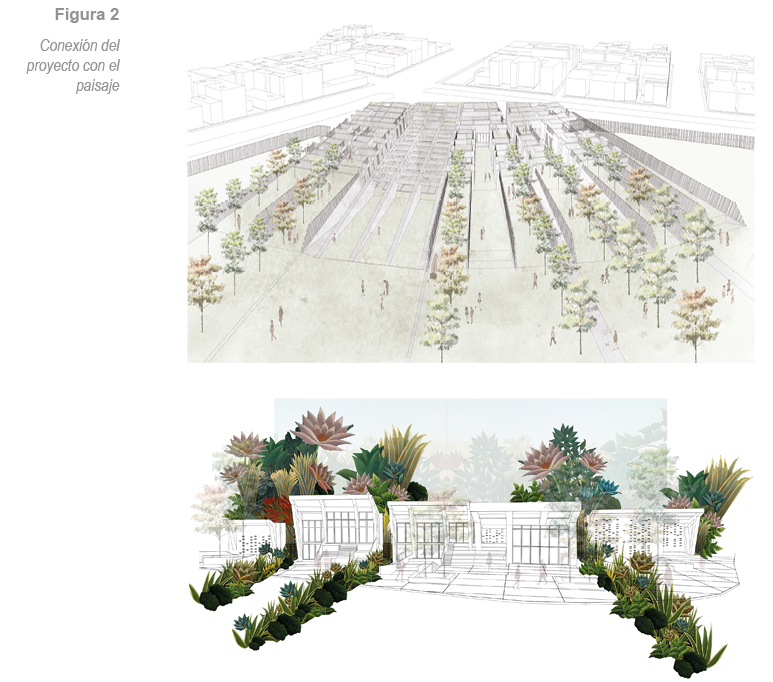 Estos espacios concentran una cantidad de texturas y patrones, desde la materialidad del proyecto (concreto estriado) hasta el proyecto paisajístico. Para esto se proponen unas alfombras arbustivas con plantas que manejen distintos tipos de texturas, puedan dar fruto, sombra y distintos olores al proyecto.