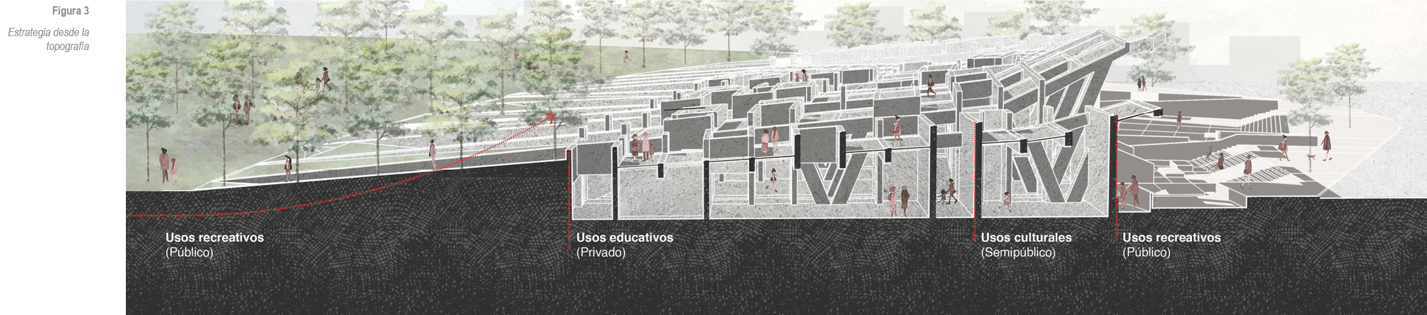 El proyecto busca difuminar sus bordes para integrarse con el ambiente natural del parque y con el barrio colindante. Para eso, se plantea el techo del proyecto como una continuación del parque. Asimismo, la parte del proyecto que se encuentra conectada a la ciudad se hunde y se abre una plaza con distintos programas recreativos y culturales. Ambas estrategias tienen el objetivo de conectar. Al hacer esto, se difumina el borde entre el parque y la ciudad. En el frente del proyecto, se coloca el programa de carácter más público con la finalidad de darle actividad a la calle, y proteger el programa privado (las aulas donde se encuentran los alumnos) del ruido y movimiento de las avenidas.