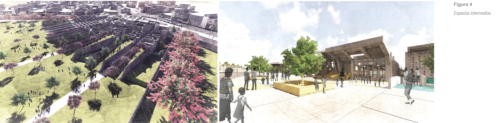 Los espacios que intermedian el parque y el proyecto, así como el proyecto y la ciudad, cumplen el rol de unir estas divisiones. Por eso, se diseñan de tal manera que cuenten con programa y siempre estén activos. Así, se cuidan los distintos niveles de privacidad para que sean espacios abiertos de libre movimiento y actividad. En la parte frontal, el proyecto se encuentra con la calle por medio de una plaza intermedia, mientras que, pegado al parque, limita con jardines, espacios para el juego y techos caminables.