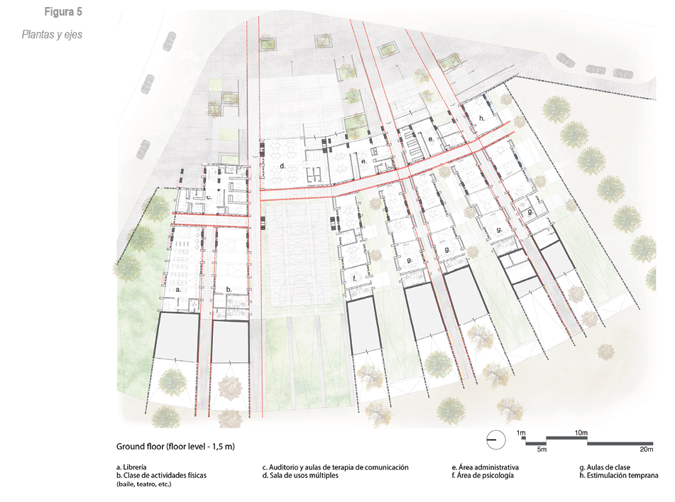 Igualmente, desde las estrategias proyectuales se busca responder a las necesidades de la corporalidad de los niños con déficit auditivo. Al basar su sistema de orientación y alerta en sentidos como la vista y el tacto, las personas no oyentes suelen atender en 360 grados y tener mayor conciencia del entorno. Por ende, el proyecto debe responder a su sistema de orientación natural. Para esto es importante que los espacios de circulación cuenten con ejes claros y fáciles de identificar visualmente. Se plantean cinco módulos programáticos y estructurales que funcionan de manera independiente, los cuales son atravesados por unos ejes que marcan las transiciones de lo público a lo privado; y se conectan por un eje transversal que atraviesa todo el proyecto.
