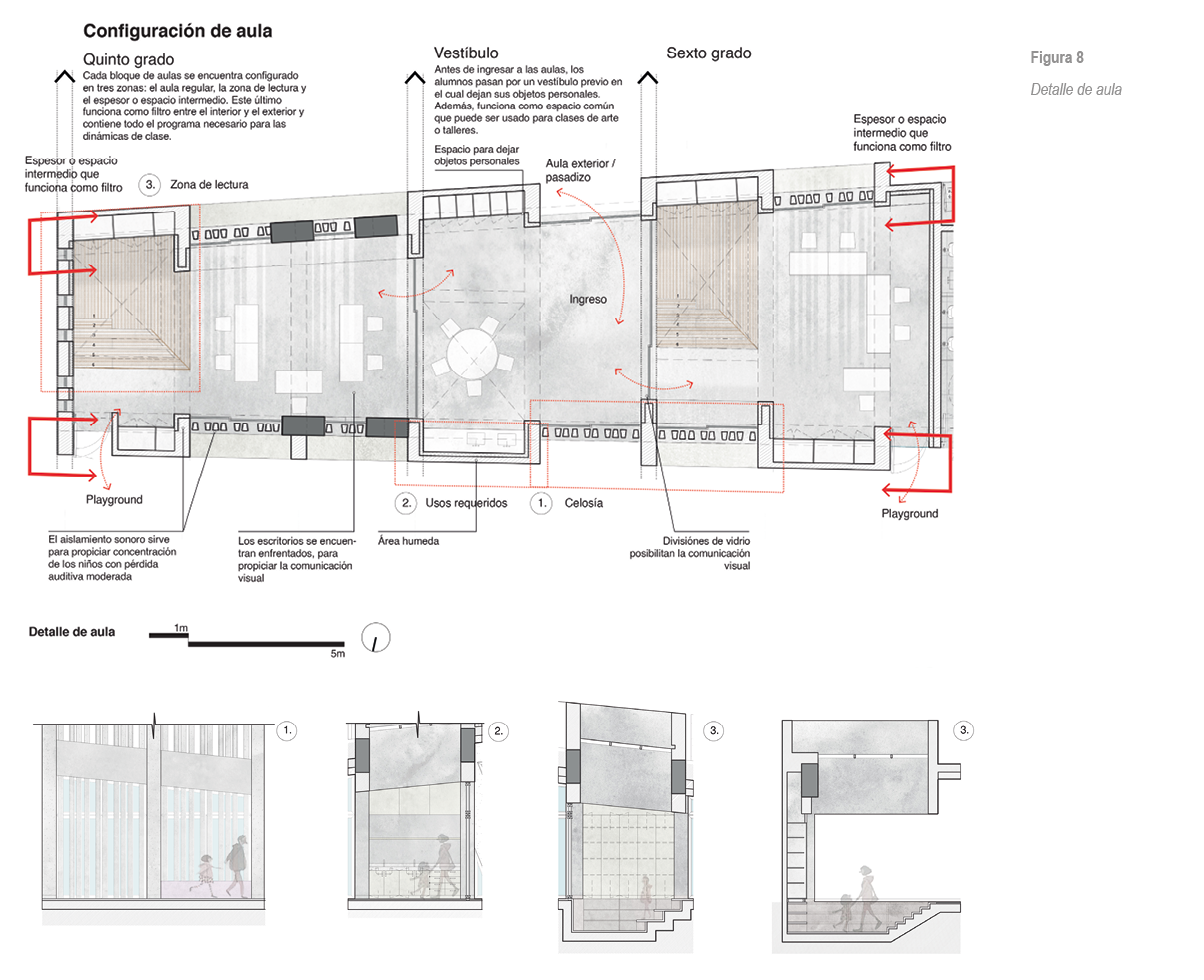 Para reforzar la estrategia, se plantean espacios intermedios, filtros y gradaciones en los bordes de los ambientes del edificio, con la finalidad de disminuir los distractores al interior de las aulas, así como generar mayor cantidad de experiencias espaciales y de movimiento. Los bloques construidos que albergan las aulas y la biblioteca, entre otros, cuentan con un espesor que permite ubicar un programa complementario en los cerramientos laterales del proyecto. Este espesor funciona como un complemento del aula y se organiza en módulos: área de lectura, área de limpieza, área de almacenamiento o celosía. De esta manera, este mismo espesor que se propone en el diseño de los muros funciona como filtro y hace posible contener el aula, generar espacios intermedios y propiciar el aprendizaje de los niños con déficit auditivo.