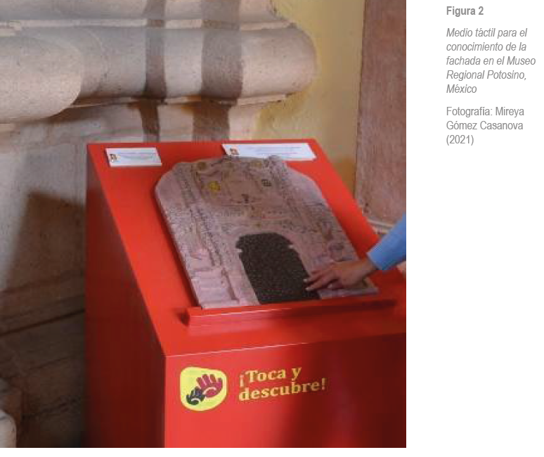La accesibilidad a contenidos para personas con ciertos tipos de diversidad funcional no es tan distinta a la de cualquier persona; por ejemplo, para una persona con diversidad funcional de tipo motriz, el énfasis residirá en la accesibilidad física, ya que para el contenido su condición no representa una barrera. Pero para otros, como las personas con diversidad funcional visual, el cómo transmitir esos aspectos que no se ven se convierte en una gran interrogante; la hegemonía de la vista o cultura visocentrista en la presentación, enseñanza e interpretación de la arquitectura y del patrimonio choca con las necesidades de este grupo social. Los espacios arquitectónicos patrimoniales, por su estética y valor reconocido, son generalmente objetos de contemplación, pero su riqueza es tal que puede ser percibida también por otros medios, como vemos en el ejemplo de las figuras 1 y 2.