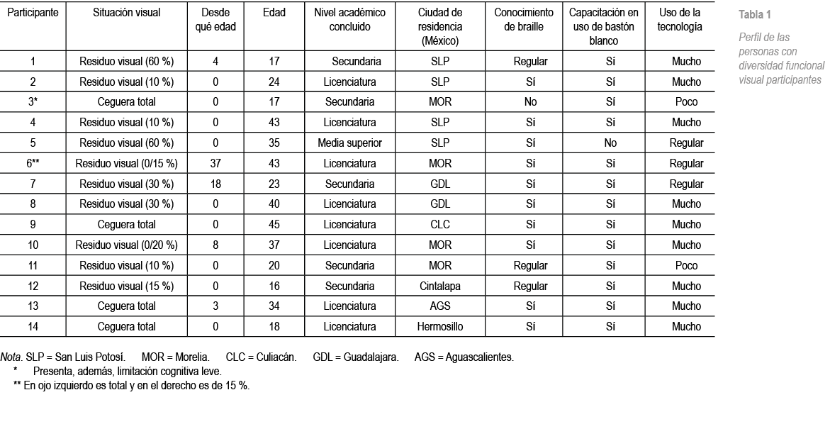 Participaron en el estudio 14 personas, residentes de diferentes ciudades del interior de México. La mayoría manifestó tener una condición de residuo visual variable y el 38,5 % fueron personas en condiciones de ceguera total. Sobre el origen de su limitación visual, el 61,5 % es ciego de nacimiento y el resto adquirió la ceguera después; la mayoría, a edades tempranas. Nueve declararon que saben braille; tres lo saben más o menos; una no contestó y una dijo que no. Ninguna cuenta con un perro guía. Sin embargo, el 92 % eñaló que ha recibido alguna capacitación sobre el uso del bastón blanco para orientación y movilidad. El nivel académico más alto es licenciatura y el mínimo, secundaria, pero esto debe analizarse según las edades de los participantes. Respecto al uso de la tecnología, el 60 % respondió que la utiliza mucho, el 30 % dijo que algunas veces y el 10 % casi no la emplea. Se entiende como tecnología a los teléfonos inteligentes, computadoras, tabletas y otros dispositivos similares (véase la tabla 1).