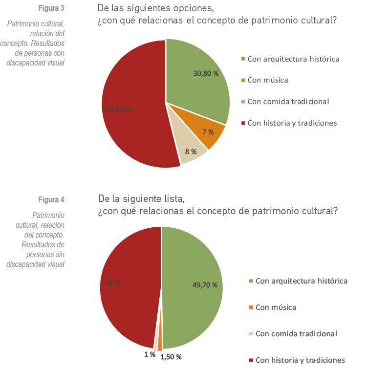 El patrimonio cultural puede tener diferentes significados. Visto desde la diversidad funcional visual, sus características estéticas y formales pierden sentido; pero los aspectos intangibles del concepto surgen con más fuerza. Según los resultados obtenidos y el previo acercamiento etnográfico por diversos medios al colectivo de la diversidad funcional visual, se puede afirmar que para ellos el patrimonio cultural está más relacionado con la historia y las tradiciones. También mencionaron otros aspectos como la comida o la música. La misma pregunta sobre el patrimonio cultural fue realizada a personas sin discapacidad visual en un estudio paralelo, y se pudo observar que la arquitectura tiene un mayor peso para las personas sin dificultad para ver, quienes prácticamente no señalan otros aspectos del patrimonio cultural (véanse las figuras 3 y 4).