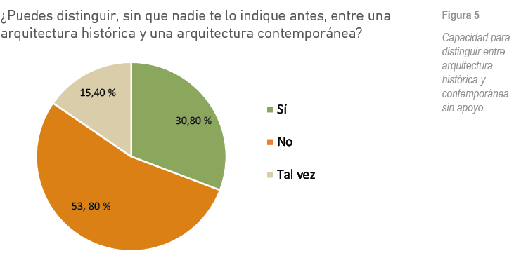 Una de las preguntas que se consideraron más relevantes es aquella sobre el reconocimiento que una persona con diversidad funcional visual, ya sea completa o con residuo visual, hace respecto de un edificio histórico: si logra reconocer, sin que nadie previamente se lo explique, si una arquitectura es histórica o no. Las respuestas se dividieron de la siguiente manera: el 53,8 % de las personas participantes dijeron que no podría distinguir la diferencia, el 15,4 % respondió que tal vez y el 30,8 % señaló que sí (véase la figura 5).