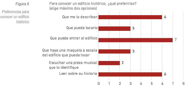 Para la pregunta: ¿de qué manera una persona con alguna desventaja en su capacidad visual prefiere acercarse al conocimiento de un edificio histórico?, se presentó una serie de opciones: la descripción, la posibilidad de entrar, la posibilidad de tocar, la opción de una maqueta táctil a escala, escuchar una pieza musical relacionada con el sitio o una lectura sobre la historia. De estas opciones, la alternativa seleccionada como preferida para conocer o dar a conocer un edificio histórico fue la posibilidad de entrar al edificio, después la descripción y leer sobre su historia. Las opciones de maqueta a escala y la posibilidad de tocar recibieron igual número de menciones; la menos escogida fue la pieza musical (véase la figura 6). La música es informativa, pero a un nivel más emocional que de conocimiento, de tal manera que resulta un recurso ideal para complementar otros medios.