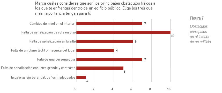 Se detectó que los obstáculos más importantes en el interior de un edificio público son los siguientes, en este orden: falta de señalización de ruta en el piso, cambios de nivel en el interior, falta de una persona guía, falta de señalización con braille, falta de señalización con letra de fuente grande y contraste, falta de un plano táctil o maqueta, escaleras sin barandal y baños no señalados (véase la figura 7).