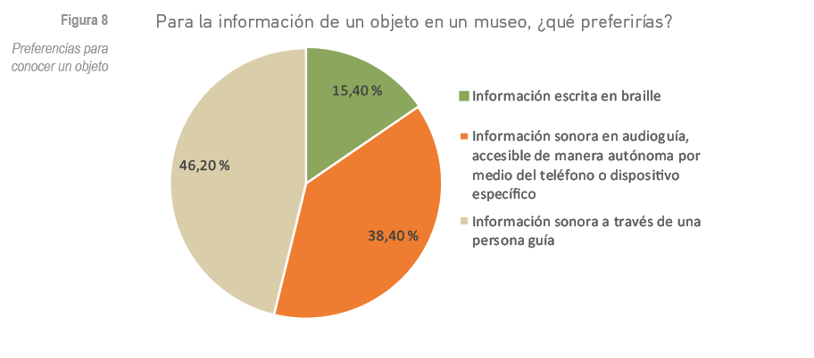 Se plantearon tres alternativas, entre las cuales, como se observa en la figura 8, claramente hay una inclinación hacia aquella que involucra un contacto humano. También, como se aprecia en la misma figura, se valoró positivamente el uso de la tecnología. Ambos recursos tienen aspectos por considerar: una persona guía puede ser flexible, adaptada y más cálida que un dispositivo electrónico; sin embargo, un recurso electrónico promueve más la autonomía e independencia. El uso de recursos por escrito en el sistema braille fue el de menor preferencia, en donde el interlocutor es más activo táctilmente, pero le toma más tiempo tener acceso a la información, como se observa en la figura 8.