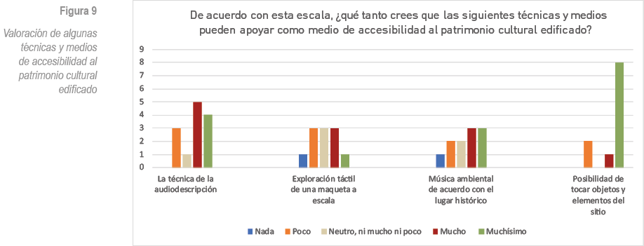 Finalmente, se solicitó a los participantes su valoración sobre algunas alternativas para la accesibilidad al patrimonio cultural edificado, las cuales no solo podrían ser aplicables al patrimonio edificado, sino también a otros tipos de objetos. Se sometieron a valoración los siguientes cuatro medios: la técnica de la audiodescripción, la exploración táctil de una maqueta a escala, la música ambiental de acuerdo con el lugar histórico, y la posibilidad de tocar objetos y elementos del sitio.