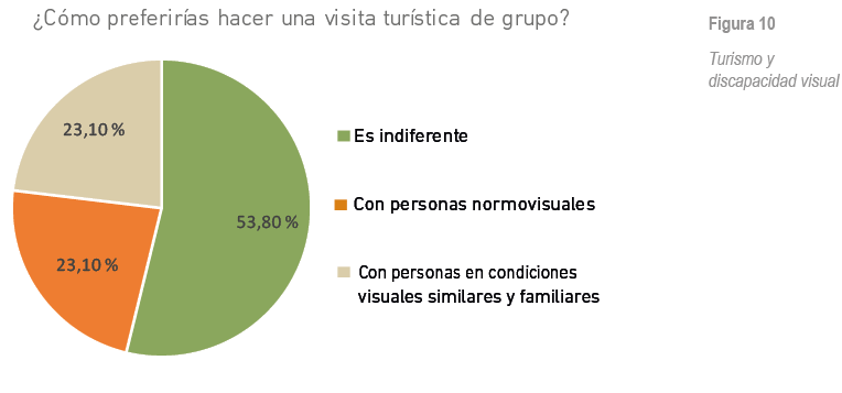 Se indagó sobre el tipo de visita grupal de su preferencia: si optaban por visitas en grupos especiales o en grupos sin distinción de diversidad funcional. Las preferencias resultantes se inclinaron a visitas sin distinción, lo que indica que la accesibilidad no debe enfocarse en medidas particulares, sino que las acciones deben ser realizadas para que, en lo posible, sirvan para todas las personas. Los resultados a esta pregunta se pueden observar en la figura 10.