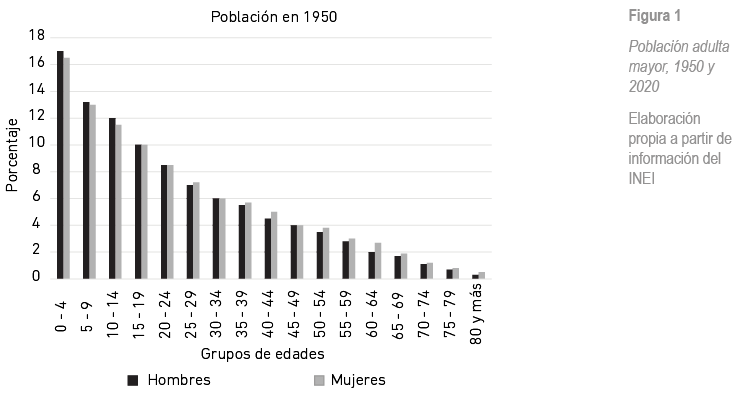 Según el último informe técnico sobre la situación de la población adulta mayor realizado por el INEI (2020), en el que, siguiendo el criterio de las Naciones Unidas, se considera como adulto mayor a cualquier persona de más de sesenta años, “En este proceso de envejecimiento de la población peruana, aumenta la proporción de la población adulta mayor de 5,7 % en el año 1950 a 12,7 % en el año 2020” (p. 1). Esto quiere decir que, con respecto a esta población, el país ha experimentado un importante cambio demográfico (Figura 1).