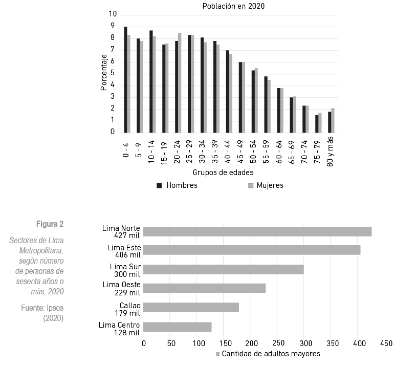 A escala de Lima Metropolitana, según Ipsos, en 2020 Lima Norte es el sector con mayor cantidad de personas con sesenta años o más (427 000), seguido por Lima Este (406 000), como se puede observar en la Figura 2. Por otro lado, Callao tiene un menor número de adultos mayores, pero es uno de los sectores que más ha tomado medidas sobre accesibilidad para estas personas.