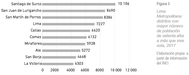 Asimismo, un estudio del INEI (2018) sobre las personas de setenta años a más que viven solas a escala nacional, basado en los censos nacionales del 2017, determinó que en Lima Metropolitana, Santiago de Surco, Lima Cercado, Callao, San Martín de Porres, Miraflores, San Juan de Lurigancho, San Borja, La Victoria, Comas y Ate son los distritos que más concentran a personas de esa edad viviendo sin compañía, en un rango que va de 4000 a 10 000 adultos mayores (Figura 3).