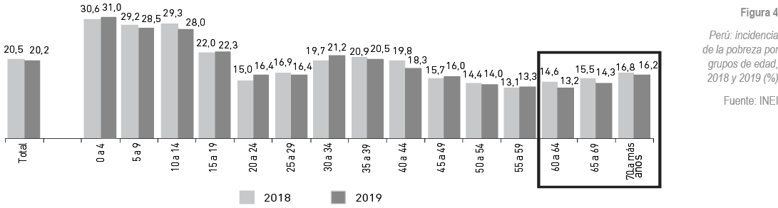 En el Perú hay diversos programas, ONG y entidades religiosas que brindan apoyo a las personas más vulnerables o que se encuentran en estado de abandono, esta última es una situación en la que se hallan muchos adultos mayores que cuentan con familia, pero que no reciben ayuda de ella. Numerosas personas mayores no tienen los recursos económicos para ingresar a una residencia geriátrica, pues la mayoría de estos albergues son privados, quedándose así en un estado de total desprotección. En la Figura 4 se puede ver la incidencia de la pobreza por grupos de edad en los años 2018 y 2019: de los sesenta años a los setenta años a más, este indicador fluctúa entre 14 % y 16 %.
