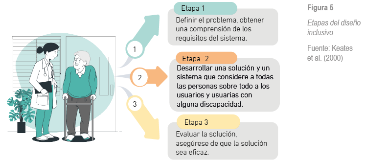 El diseño inclusivo es un enfoque dirigido al ámbito arquitectónico. Guarda relación con el diseño universal, pues ambos términos funcionan bajo la premisa de incluir y favorecer a usuarios que comúnmente no son considerados a la hora de planificar o diseñar un proyecto. En el caso del adulto mayor, el diseño inclusivo le permite un alto grado de independencia para realizar sus actividades cotidianas. Según Keates et al. (2000), las tres etapas de un diseño inclusivo son: definir el problema, desarrollar una solución y evaluarla (Figura 5). Para ello se debe analizar la información, considerando el diagnóstico del usuario, la vivienda, los objetos que interactúan con la persona, el entorno y los servicios. También es importante tomar en cuenta a los profesionales encargados del diagnóstico físico y psicosocial.