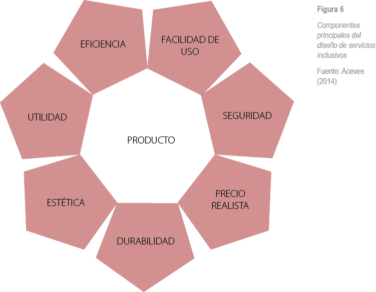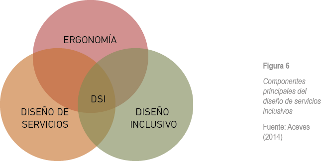 Para potenciar los espacios inclusivos, también es necesario pensar en las experiencias que brindaremos a través de otros elementos. Aceves (2014) señala que el diseño de servicios inclusivos es un enfoque del diseño que rescata los objetivos de la ergonomía al buscar la integración del usuario en los sistemas mediante la adaptación del entorno a las características del ser humano, sintetizando las bases teóricas de la ergonomía e integrando dos corrientes de diseño: el diseño inclusivo y el diseño de servicios. Dul et al. (2012) afirman que este enfoque busca que la interacción con un sistema, y la experiencia del usuario, respondan a las características y expectativas del mayor rango posible de individuos. Asimismo, se destaca la importancia de conocer los problemas que limitan la seguridad, el uso y la satisfacción de los usuarios respecto al servicio, con el objetivo de encontrar alternativas para facilitar el acceso a la mayoría de la población y alentar el desarrollo socioeconómico. En la Figura 6 se puede apreciar los tres componentes principales del diseño de servicios inclusivos.