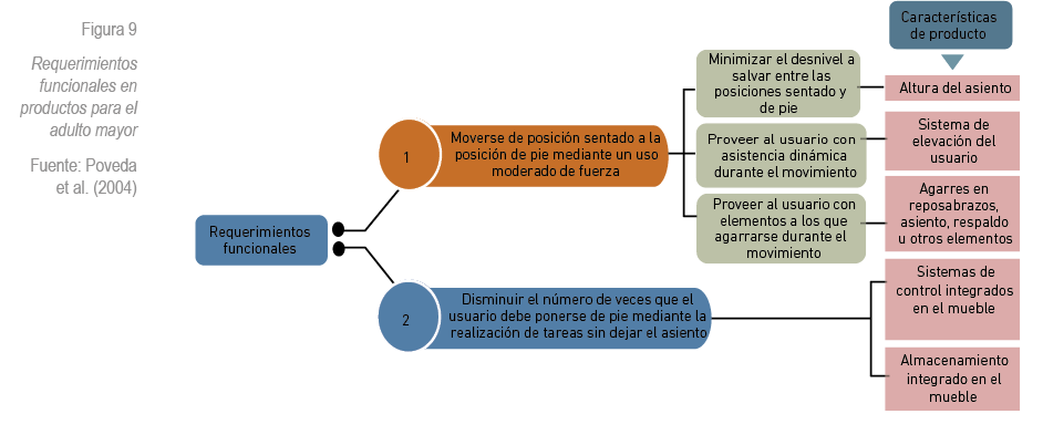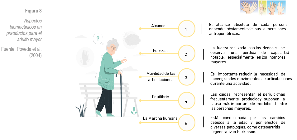 La ergonomía es de gran ayuda para los adultos mayores, que experimentan muchos cambios (como la pérdida de masa muscular, que ocasiona una carencia de fuerza), y que por ello necesitan un entorno especialmente adaptado a sus necesidades. Para lograrlo, se debe hacer un minucioso análisis de las necesidades y capacidades del usuario, tanto físicas como cognitivas, buscando mejorar su calidad de vida. Sevilla y González (2008) explican que, en el caso del adulto mayor, algunos beneficios de la ergonomía son que le permite estar en un espacio donde puede desplazarse por sí mismo, le ayuda a fortalecer sus destrezas para desarrollar actividades cotidianas, y contribuye a compensar la pérdida de habilidades físicas, psíquicas y sensoriales. En la Figura 8 se observa los aspectos biomecánicos que se deben tener en cuenta a la hora de diseñar un producto para el adulto mayor, y en la Figura 9, los requerimientos funcionales.