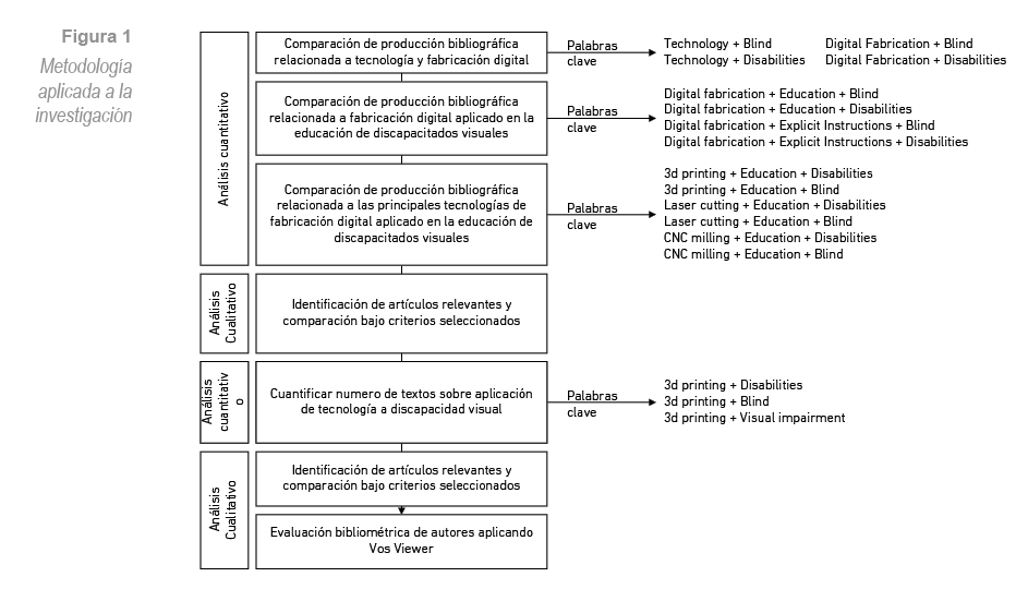 Las preguntas que nos planteamos son las siguientes: ¿las tecnologías de fabricación digital son utilizadas en la promoción de entornos educativos inclusivos para estudiantes con discapacidad visual moderada a severa?; ¿cuáles son los contextos prácticos de su aplicación?; ¿cómo se aplican?; ¿cuáles son las tecnologías de fabricación digital más utilizadas? Combinamos los procesos de revisión de literatura y análisis bibliométrico para identificar las experiencias de aplicación de las tecnologías de fabricación digital al campo de la educación formal de personas con discapacidad visual moderada a severa. Y, teniendo en cuenta que la instrucción explícita es la metodología base para el desarrollo de capacidades académicas, tanto en entornos educativos convencionales como en los de educación especial (McLeskey et al., 2017), utilizamos como marco de evaluación los pilares de la metodología para el análisis, clasificación y síntesis cualitativa de casos, evaluando el rol que desempeña en la promoción de la educación inclusiva para personas con discapacidad visual moderada a severa.