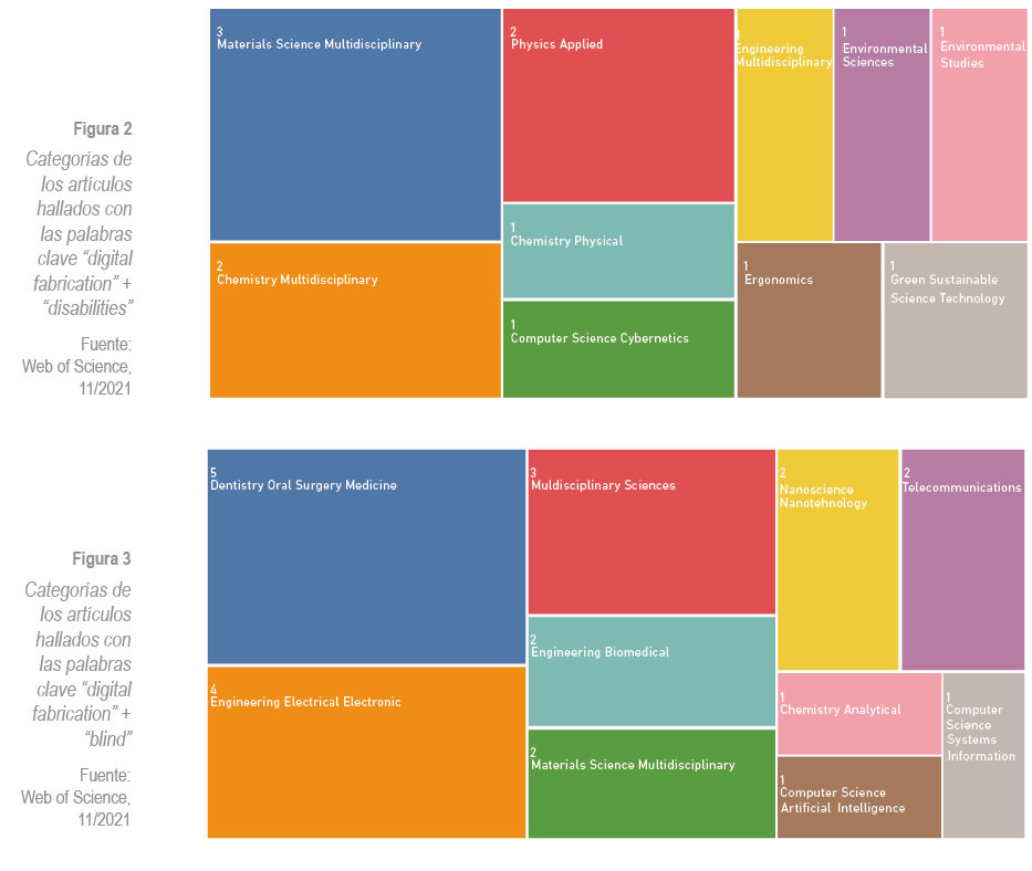 La combinación de “technology” + “disabilities” arrojó 1196 artículos en la categoría educación, que incluye los tópicos “education special”, “education educational research”, “psychology educational” y “education scientific disciplines”. La combinación con la palabra clave “blind” generó una disminución radical del número de publicaciones a 191 en los tópicos “education educational research”, “education scientific disciplines” y “education special”. Similar procedimiento se aplicó para las combinaciones con “digital fabrication”, no encontrándose, en ninguno de los casos, artículos en la categoría educación.