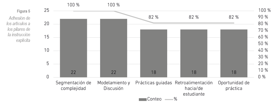 El análisis de adhesión de las investigaciones a los pilares de la instrucción explícita nos revela que en el 75 % de artículos la impresión 3D aporta a los cinco pilares. Como se observa en la Figura 5, el 100 % de los casos aporta a los dos primeros pilares: segmentación de habilidades complejas y modelado-discusión del contenido. ¿Cómo es esto posible? En los siguientes párrafos revisamos algunos casos particulares.