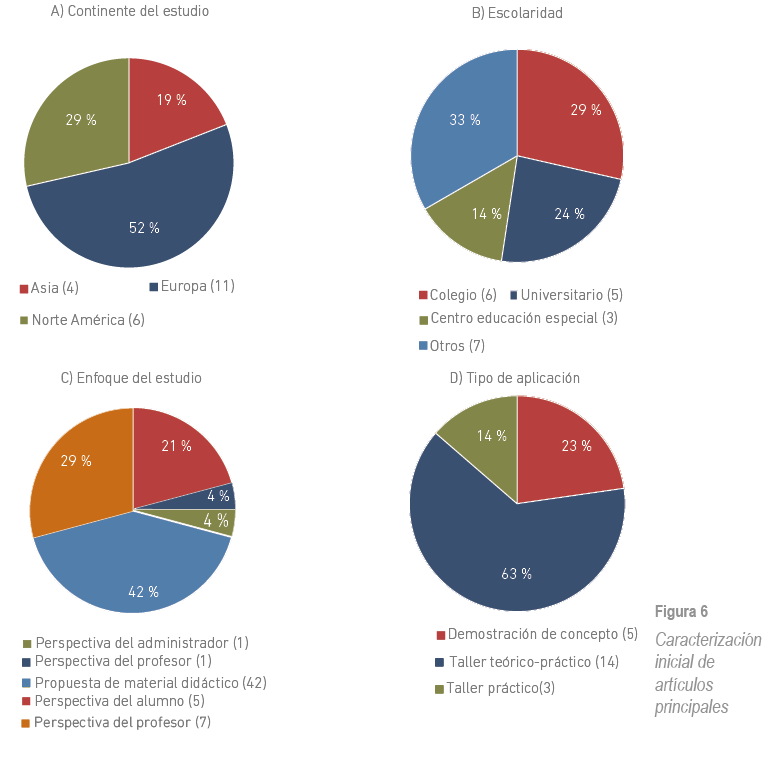 Finalmente, cuando se analiza el tipo de aplicación (figura 6D), se determina que casi un 77 % se enfoca en talleres prácticos (Smith, 2020; Grumman & Carroll, 2019; Wedler, 2012; Wu, 202; Bonnet de León, 2020; Giraud, 2017; Jain, 2018; Hernández Sánchez, 2020; Singhal & Balaji, 2020; Gual-Orti, 2015; Götzelmann, 2018; Mcloughlin, 2016; Kostakis et al., 2015; See, 2021) o teórico prácticos (Díaz-Navarro & Sánchez de La Parra-Pérez, 2021; Molins-Ruano, 2018; Buehler, 2016). Esta tendencia podría indicar la búsqueda de participación de los estudiantes con discapacidad visual moderada a severa, que es coherente con la adherencia a los pilares de la instrucción explícita. El resto de publicaciones se centran en demostraciones de conceptos (Clements, 2016; Koelemeijer & Winterbourne, 2021; Evelyn-Wright et al., 2020; Buehler, 2016; LeSuer, 2019).