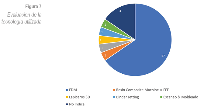 Por otro lado, y desde una perspectiva técnica, el 77 % de las aplicaciones emplean tecnología de modelado por deposición fundida (FDM, por sus siglas en inglés), aunque también se han revisado casos en los que se mencionan otras tecnologías, como lapiceros 3D, escaneo y modelado, etcétera. Cabe preguntarse el porqué de esta preferencia, pudiéndose evaluar no solo aspectos de costos, sino también otros de mayor interés, como la curva de aprendizaje, el soporte técnico, el costo y el acceso a insumos y la utilidad en el entorno educativo.