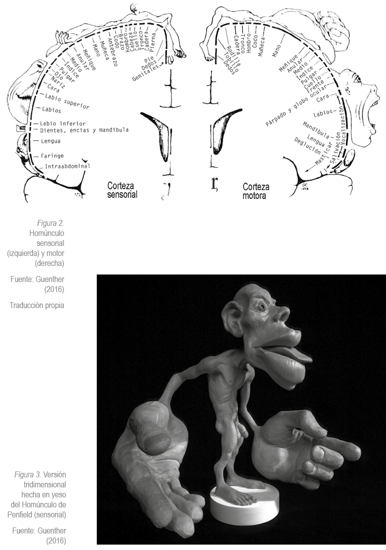 Lo que se sabe de la percepción, desde el ámbito del diseño arquitectónico, se basa mayormente en lo visual; también se basa en el aspecto físico (escala humana y antropometría), en el movimiento del cuerpo y el desplazamiento de las personas, en las variables del entorno (iluminación, acústica, acondicionamiento ambiental, etcétera) y, aunque de forma menos precisa, en el aspecto simbólico. Sin embargo, los alcances de la percepción humana en los espacios, lo que ello implica para la construcción de significado en las personas y su impacto en el desarrollo humano, son aspectos que no se trabajan en la carrera, quizás porque requiere del diálogo con otras disciplinas. Esta idea puede ejemplificarse con el conocimiento del Hombre de Vitruvio y el Modulor de Le Corbusier, así como el desconocimiento de otros gráficos sobre el cuerpo que podrían ser la ruta para entender lo que implica la arquitectura en la mente. Tal es el caso del Homúnculo de Penfield (véanse las figuras 2 y 3), novedoso y comunicativo dibujo realizado por el neurocirujano Wilder Penfield (1950), donde los tamaños de las partes del cuerpo representan las áreas del cerebro que abarcan el funcionamiento sensorial y motor; es por eso que se observa un rostro y manos gigantescas, haciendo evidente la percepción háptica: la capacidad de percibir mediante la piel las características del entorno (humedad, calor, texturas, etcétera).