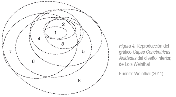 Lois Weinthal (2011) realizó una antología de la teoría del diseño interior y la ordenó en un gráfico (véase la figura 4) de ocho capas concéntricas alrededor del ser humano: (1) cuerpo y percepción, (2) ropa e identidad, (3) muebles y objetos, (4) colores y superficies, (5) mapeo del interior, (6) recámaras privadas, (7) performance pública y (٨) conexión del interior con el exterior. La autora usa la metáfora de una cebolla para explicar que se trata de capas que se superponen y que comparten relaciones espaciales. En el gráfico se observa que no son círculos perfectos exactamente separados, por el contrario, se cruzan, se intersectan y se traslapan; son algo tan orgánico como la mente y representan las diferentes capas de diseño que muestran su proyección en el espacio. Dicha antología contiene ensayos y trabajos de artistas y diseñadores de diversos rubros, y muestra sus procesos de diseño, así como los significados y condición existencial de sus creaciones. Diversos ensayos abarcan también la inquietud que despierta la proyección de la mente en el diseño y la influencia de los espacios en ella.