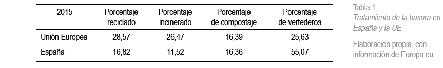 Como se puede observar en la tabla, especialmente en España, más de la mitad de los residuos generados por las personas son desechados y por lo tanto inservibles, mientras que tan solo un 16,82 % de ellos, son objeto de procesos de reciclaje. Estas enormes cantidades de basura son un importante problema medioambiental que en algunas ciudades del mundo produce muchas enfermedades y graves problemas de salubridad para sus habitantes.
