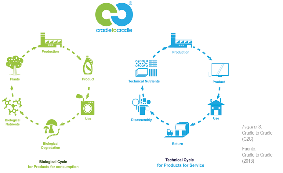 Más tarde, el químico alemán Michael Braungart y el arquitecto norteamericano William McDonough recuperaron el concepto del cradle to grave para hacer referencia a una consideración errónea de la naturaleza como una fuente inagotable de recursos, los cuales acaban destruidos y convertidos en basura inutilizable, un modelo económico que solo tiene un destino posible, la creación de tremendas cantidades de contaminación y residuos. Por lo contrario, ellos plantean un sistema en el que existan dos ciclos, el biológico y el tecnológico. El primero abarcaría todo lo que son productos para el consumo, que contienen nutrientes y materias biodegradables, de modo que, una vez terminada su vida útil, estas puedan ser devueltas a la naturaleza. El segundo contendría todo lo que son servicios, formados por “nutrientes tecnológicos” los cuales deberán ser desmontados y devueltos al ciclo productivo una y otra vez, infinitamente (“The Circular Economy: Interview with Walter Stahel”, 2013).