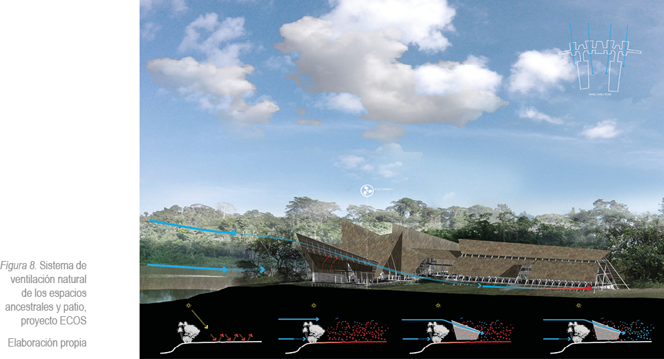 Estos espacios ancestrales, además de estimular los quehaceres propios de la comunidad, tienen otros usos importantes en términos bioclimáticos. Por un lado, redireccionan los vientos mediante una doble cobertura, la cual permite ventilar de manera natural el interior y el patio central de la escuela. El doble techo crea un efecto de embudo que, por un cambio de presión, asegura un flujo de aire fresco, llamado el efecto Venturi. Por otro lado, el techo capta el agua de las lluvias para poder almacenarla en recipientes cerrados que se encuentran entre el piso natural y el piso del proyecto siguiendo la lógica constructiva de las casas asháninkas.