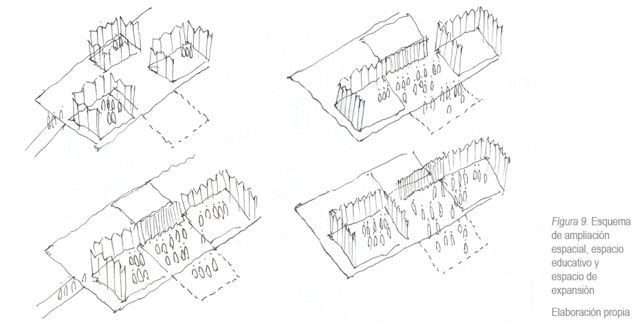 Aunque los espacios educativos han sido concebidos con la idea de que el salón es el único espacio por excelencia para compartir el conocimiento limitando el área educativa a cuatro paredes y un techo, el Minedu ha hecho un esfuerzo para ampliar el concepto de espacio educativo en donde las áreas naturales como una chacra o espacios verdes pueden ser también espacios de aprendizaje. Esta idea está más ligada al concepto integral de cosmovisión asháninka, ya que ellos aprenden de manera empírica en grandes espacios rodeados de la naturaleza. Dentro de la cosmovisión de esa comunidad, los espacios acogen a los animales, plantas, agua y demás seres de la naturaleza que interactúan con la comunidad. Esta relación resulta de vital importancia para ellos, ya que constituye una sola unidad de interacción entre la naturaleza y los seres humanos (UNICEF, 2012). Por esta razón, el proyecto ECOS propone salones flexibles que puedan resolver diversas situaciones pedagógicas, pero sin perder el vínculo con el exterior, con la capacidad de replicarlo si fuera necesario. De esta manera, se pueden ampliar los metros cuadrados por estudiante durante la clase. Se puede armar, por ejemplo: