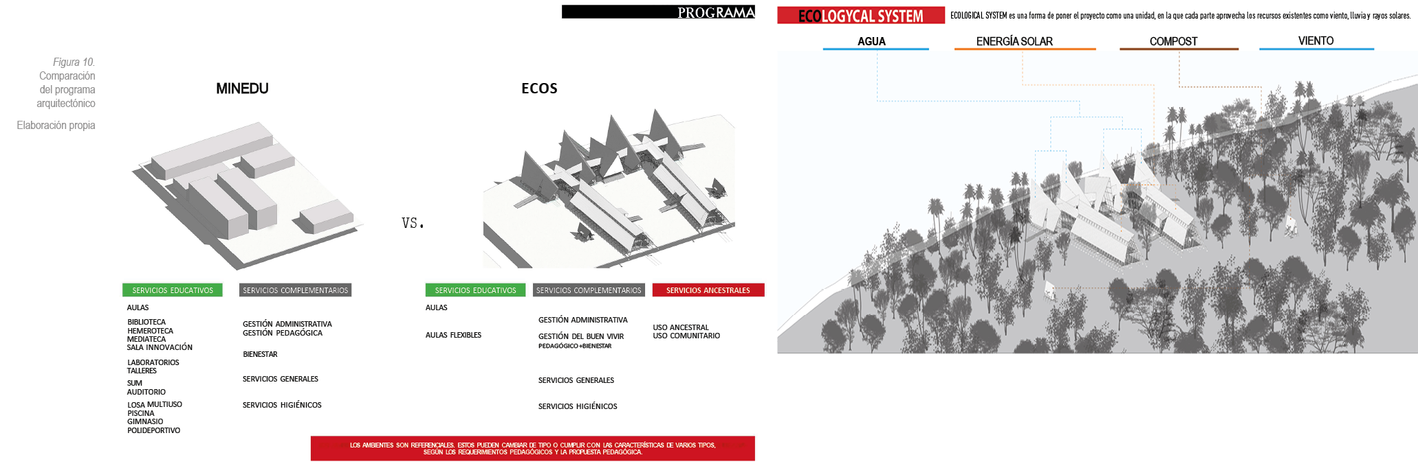 A diferencia de la casa asháninka, la construcción de las escuelas públicas en zonas rurales posee una gran huella constructiva con salones cerrados desligando el interior del espacio educativo del exterior del espacio natural. Además, los patios tienden a estar separados por edades; es decir, primaria y secundaria son el reflejo espacial del currículo educativo, los cuales dificultan la integración espacial. Ante ello se busca dar un nuevo rumbo mediante la idea de cosmovisión para que el espacio sea una herramienta de vínculo entre el entorno, las actividades ancestrales y educativas. La arquitectura de las comunidades indígenas no sigue la moda, sino responde al entorno y a métodos constructivos propios del lugar (Rudofsky, 1964).