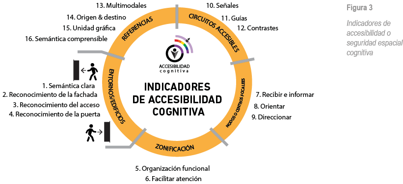 Ante la ausencia de normativa sobre accesibilidad cognitiva, desde hace diez años se investiga la aplicación de un paradigma difundido entre especialistas en accesibilidad universal interesados en un enfoque fundamentado en el funcionamiento del sistema nervioso humano. El modelo para diseñar espacios accesibles y sus componentes (reunidos en un índice que se calcula con base en indicadores) corresponde a un innovador sistema de apoyos inicialmente concebido para la orientación espacial según las funciones neurológicas del sistema nervioso humano (SNH): aferentes sensoriales, de la percepción y la cognición, eferencias motoras y emociones, a través de las cuales se pueden concretar o inferir escenarios o patrones de diseño y arquitectura para llevar a cabo proyectos que tengan como centro a la persona en su compleja interacción anatómica y funcional.