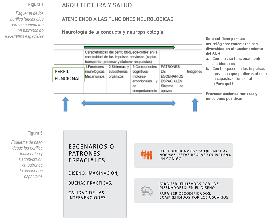 Los perfiles funcionales se basan en componentes sensoriales, de la percepción, cognitivos, motores y emocionales (teorías, bases empíricas y sistemáticas). Su objetivo es establecer reglas de diseño para la orientación, el direccionamiento y la activación neuronal a través del sistema de apoyos: relaciones de formas, funciones y dimensiones métricas en una secuencia sin fracturas, para que no se produzca el efecto laberinto.