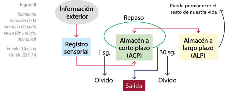 Es importante saber que la memoria de corto plazo, de trabajo, operativa (con algunas variaciones entre ellas) tiene siempre una duración muy corta. Considerar esta condición es especialmente importante en personas con deterioro cognitivo y, sobre todo, para personas con discapacidades intelectuales que sean autónomas (sin apoyo humano). En este caso, se requiere siempre un tipo de guía en su camino para que puedan mantenerse orientadas y direccionadas en largos recorridos, como intercambiadores, estaciones de metro y tren. La colocación de colores, guías y señales (que pudieran olvidarse en los recorridos), pautadas cada tanto tiempo cuando el recorrido fuera longitudinal (el que dura la información de la memoria, aproximadamente de 35 a 40 segundos), facilitará el encuentro de sus actividades sociales, educativas, recreativas o de su lugar de trabajo.