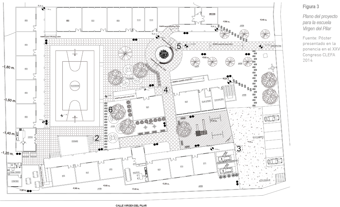 Se conformó un equipo académico con estudiantes de Diseño Inclusivo 2014 para el relevamiento de la situación, propuesta de un proyecto y desarrollo ejecutivo para su implementación. A continuación, se muestran imágenes y planos del proyecto accesible presentado para las mejoras en la escuela Virgen del Pilar en Capiatá, Paraguay, ejecutado el año 2014.