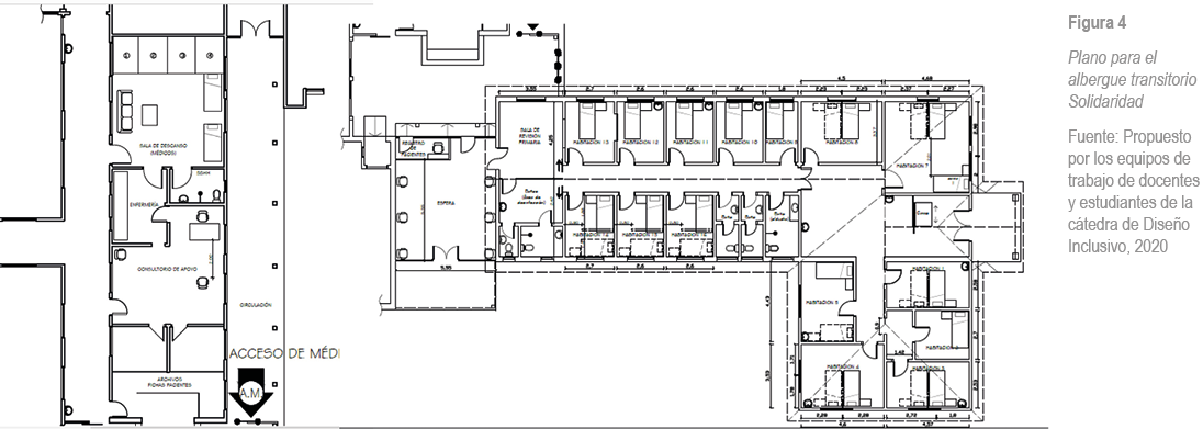 Desde la cátedra de Diseño Inclusivo de la FADA UNA, se propone la refuncionalización y adaptación de las instalaciones del complejo edilicio de la Fundación Solidaridad, con un diseño acorde a las características de espacialidad y volumetrías existentes, pero con una nueva funcionalidad en las condiciones nacionales de protección sanitaria contra el COVID-19. El equipo académico estuvo conformado por dos docentes y seis estudiantes de la cátedra, quienes realizaron los trabajos de verificación de las instalaciones y relevamiento para la refuncionalizacion de los bloques edificados; dejaron uno de ellos en condiciones adecuadas para el albergue transitorio.