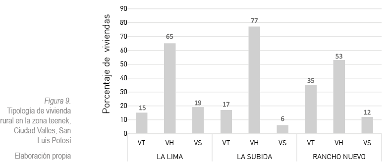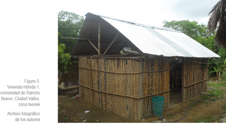 De acuerdo con las diferentes tipologías de la vivienda que se encuentran en la Huasteca Potosina (en nuestro caso de estudio, es el Municipio de Ciudad Valles) y las unidades de análisis tomadas (que son de las tres comunidades de la zona teenek), se tiene como primeros resultados que la tipología de vivienda que predomina es la híbrida, compuesta por materiales industriales y vegetales (más del 50 %). En segundo lugar está la vivienda tradicional