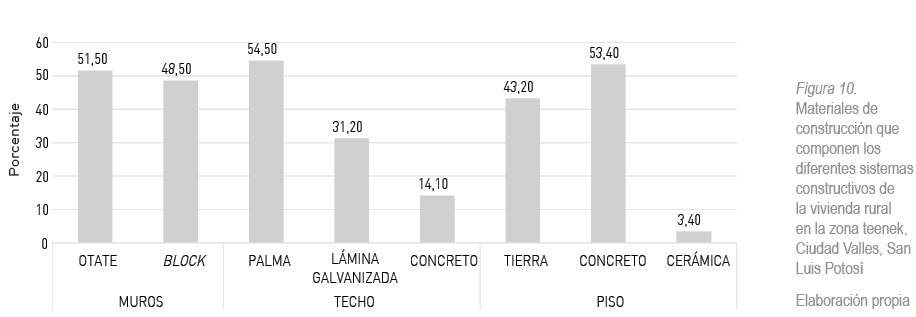 La identificación de las diferentes tipologías nos ayudó a describir las características de las viviendas rurales. En su mayoría, estas están conformadas por sistemas constructivos compuestos por los dos diferentes tipos de materiales: naturales e industriales (véase la figura 10).