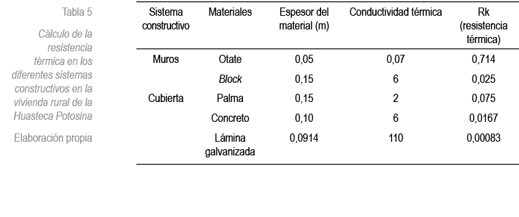 Como parte de esta investigación, también se analiza el comportamiento térmico de los materiales, con el objetivo de conocer cuáles de ellos con sus características resultan más favorables en la construcción de la vivienda rural en la Huasteca Potosina. La tabla 4 muestra datos térmicos de los materiales.