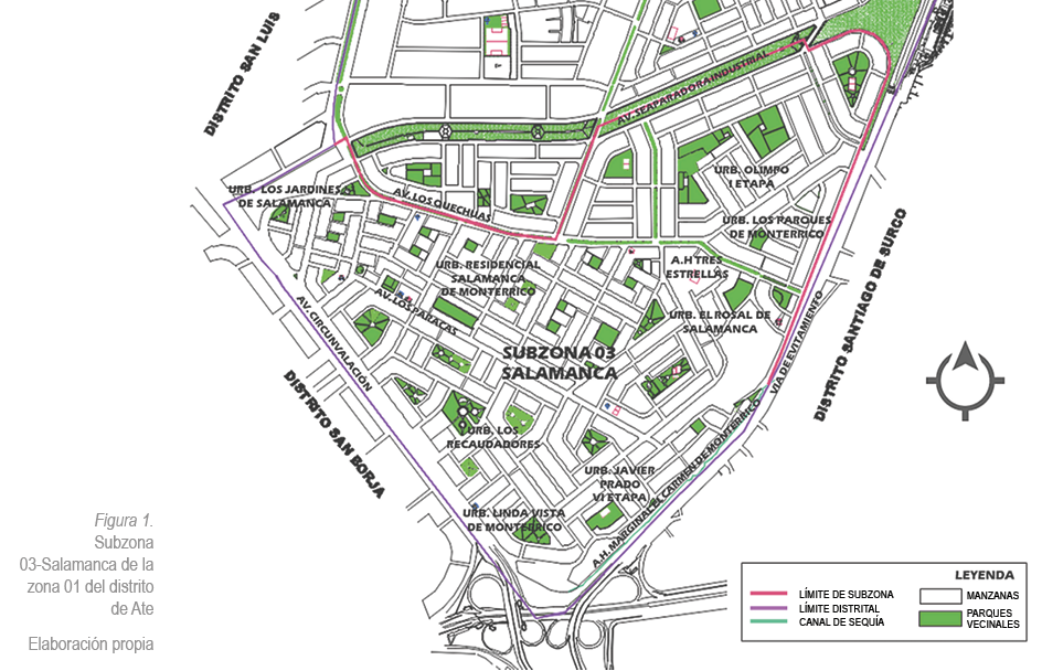 En relación con esta situación, la subzona 03 de la zona 01 del distrito de Ate es un área consolidada y acogedora donde predominan las urbanizaciones, cuenta con accesibilidad a distritos importantes de la metrópoli: Santiago de Surco, San Luis y San Borja (Municipalidad de Ate, 2003), y posee la mayor cantidad de parques del distrito, en buen estado de conservación, razón por la cual pertenece al pulmón del distrito de Ate (Municipalidad de Ate, 2003). Sin embargo, dicha zona experimenta un cambio de morfología urbana por la sustitución de residencias unifamiliares por edificios multifamiliares, lo que incrementa rápidamente la cantidad de población (Galvez Nieto, 2019) y reduce la presencia del arbolado urbano que permanece solo en los parques vecinales, siendo retirado de las bermas de las calles. El manejo municipal del arbolado urbano se basa únicamente en los procesos de mantenimiento de las especies arbóreas, de las especies arbustivas y las superficies de los parques, a través del riego, corte del pasto y poda de árboles. Ante esto, ¿el área de Salamanca es una zona “verde” con suficiente presencia de verde?