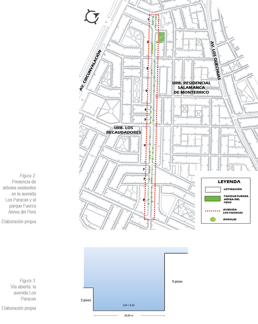 Debido al estado de consolidación de la trama urbana, el suelo no posee impermeabilidad, debido a la presencia del asfalto de las vías vehiculares, del concreto de las veredas y las construcciones de viviendas multifamiliares. Los retiros de las calles son utilizados como estacionamientos o son reemplazados por rampas para el acceso vehicular a las edificaciones. Los parques son los principales componentes permeables en la zona de estudio. Por esta situación, la distribución de los árboles es aleatoria a lo largo de la avenida Los Paracas (véase la figura 2).